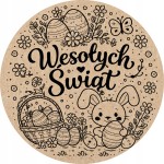 Centralnym elementem kompozycji jest czytelny, elegancki napis Wesołych Świąt, otoczony subtelnymi ilustracjami zajączka wielkanocnego, pisanek, koszyczka z jajkami, kwiatów oraz pisklaka. Motywy wielkanocne są lekkie wizualnie, przyjazne i jednoznacznie kojarzą się z Wielkanocą, wiosną oraz świąteczną atmosferą.